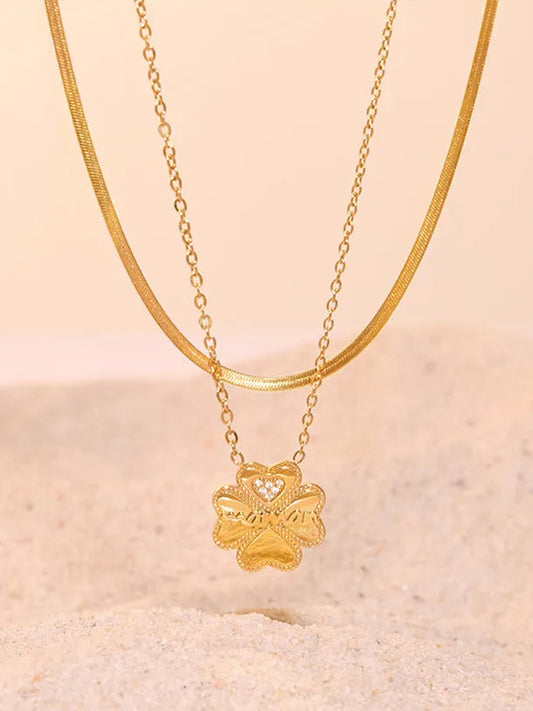 2 Piece 18K Gold-Plated Inlaid Zircon Lucky Clover Necklace